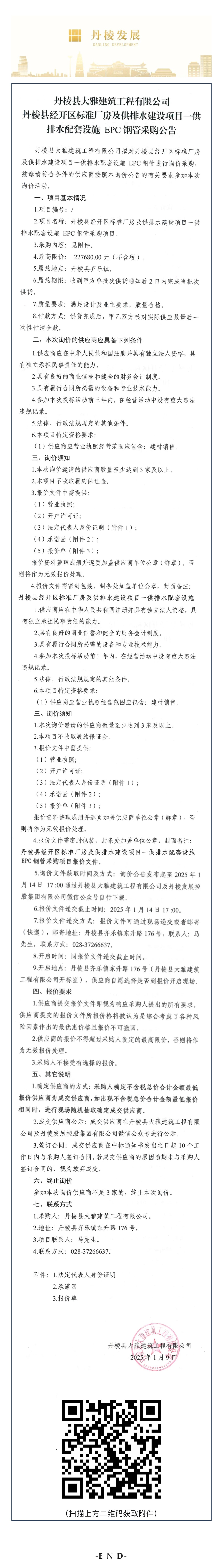 丹棱縣大雅建筑工程有限公司丹棱縣經(jīng)開(kāi)區(qū)標(biāo)準(zhǔn)廠房及供排水建設(shè)項(xiàng)目一供排水配套設(shè)施 EPC鋼管采購(gòu)公告