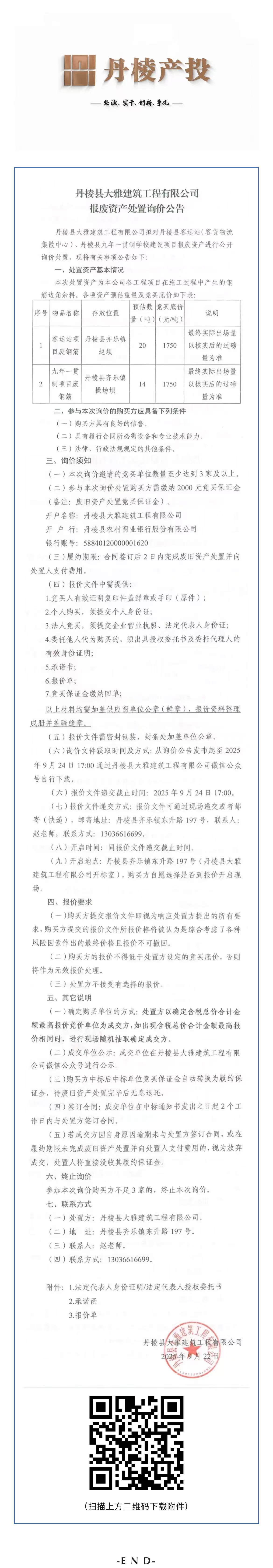 丹棱縣大雅建筑工程有限公司報(bào)廢資產(chǎn)處置詢價(jià)公告