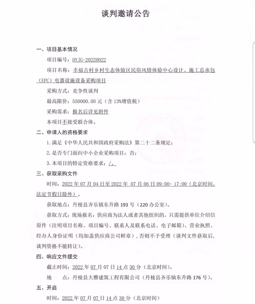 幸福古村鄉(xiāng)村生態(tài)體驗區(qū)民俗風情體驗中心設計、施工總承包(EPC)電器設施設備采購項目談判邀請公告