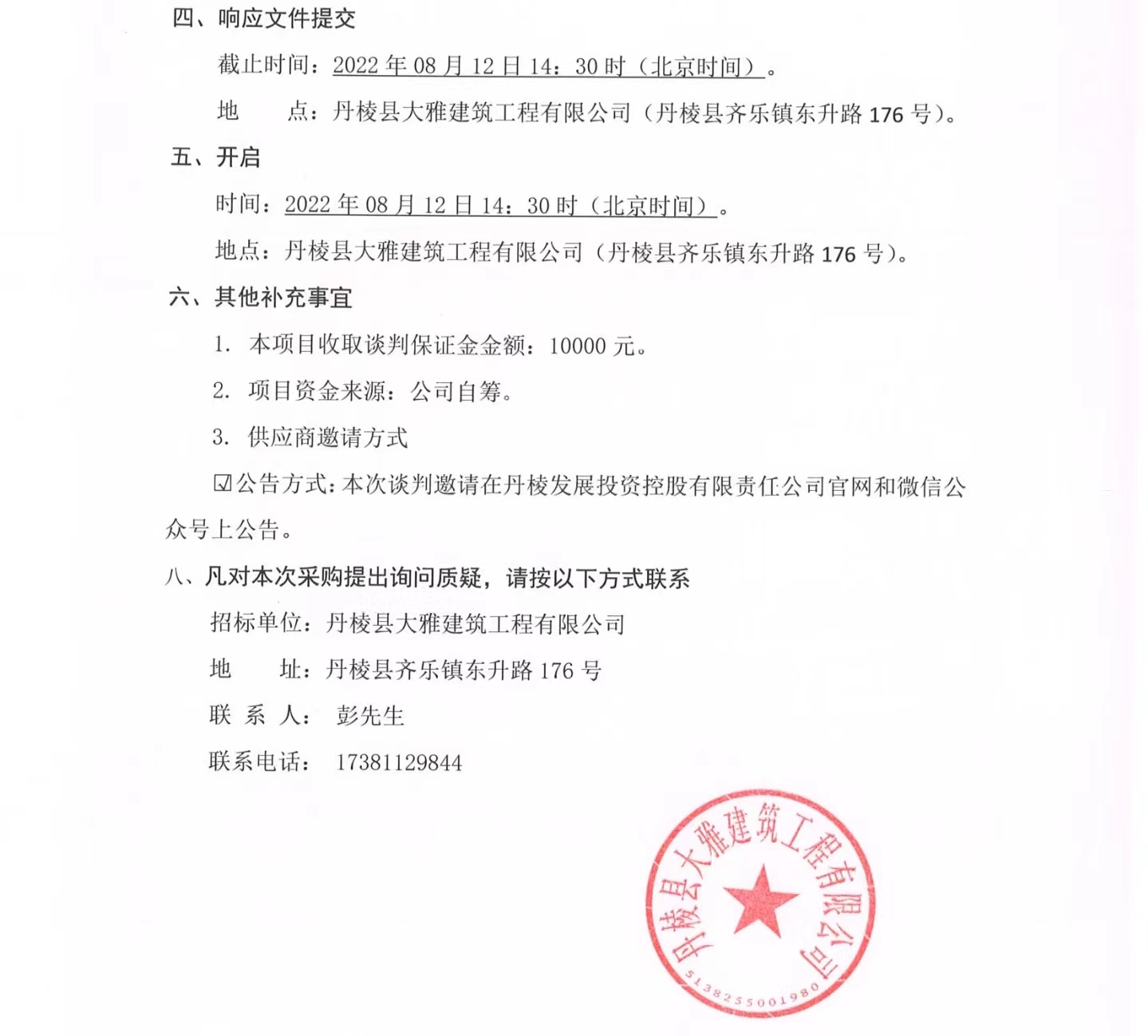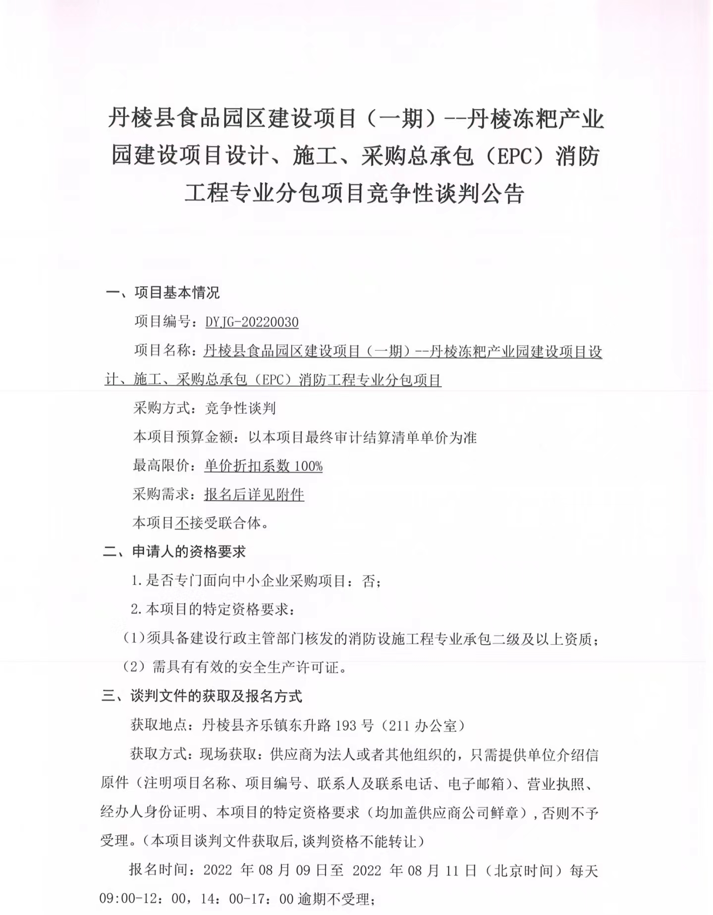 丹棱縣食品園區(qū)建設(shè)項(xiàng)目(一期)--丹棱凍粑產(chǎn)業(yè)園建設(shè)項(xiàng)目設(shè)計(jì)、施工、采購總承包(EPC)消防工程專業(yè)分包項(xiàng)目競(jìng)爭(zhēng)性談判公告