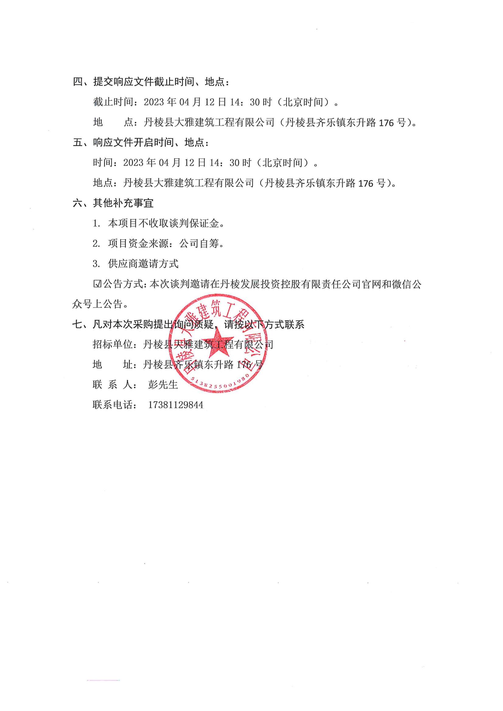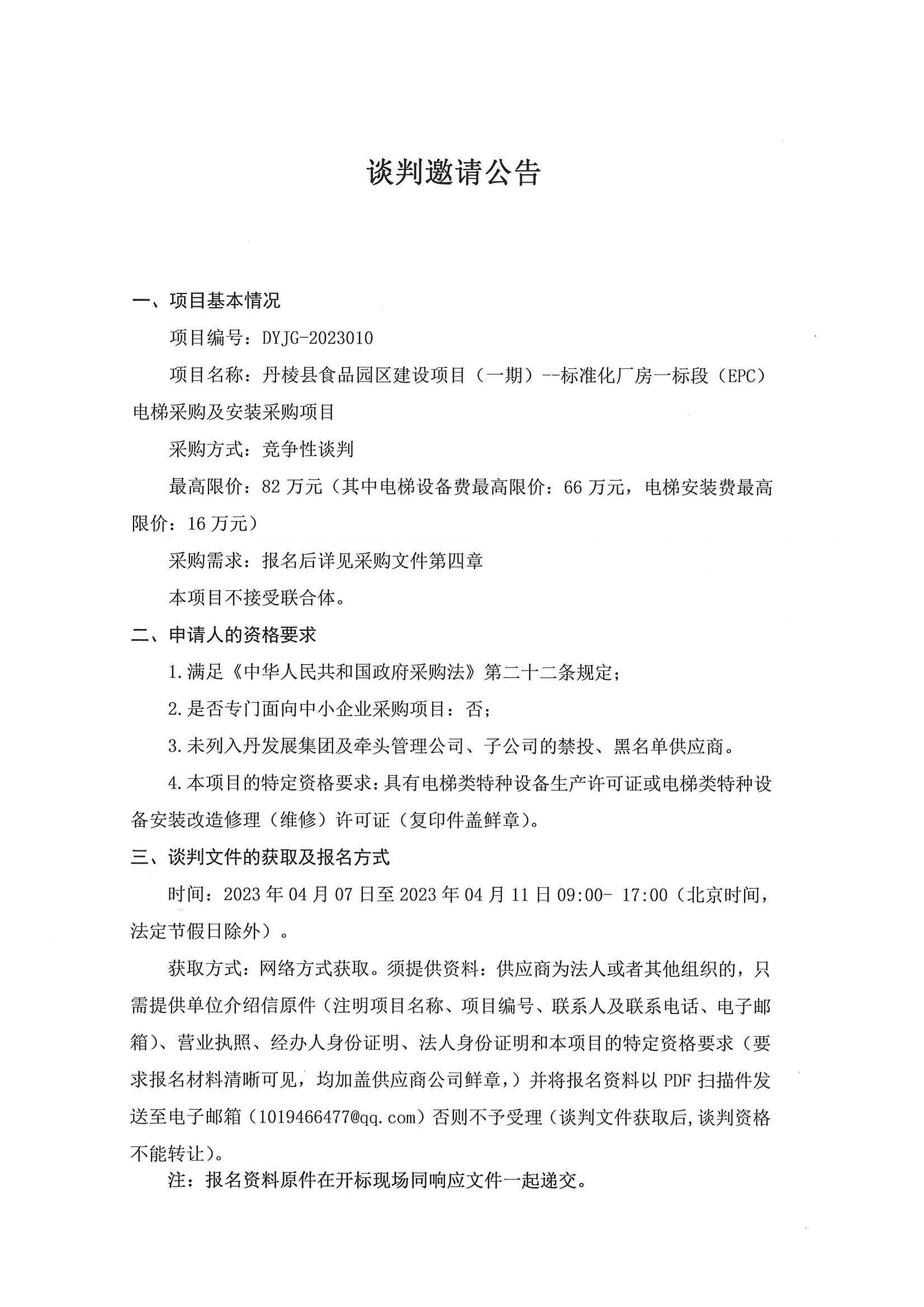 丹棱縣食品園區(qū)建設(shè)項(xiàng)目(一期)--標(biāo)準(zhǔn)化廠房一標(biāo)段(EPC)電梯采購及安裝采購項(xiàng)目談判邀請(qǐng)公告