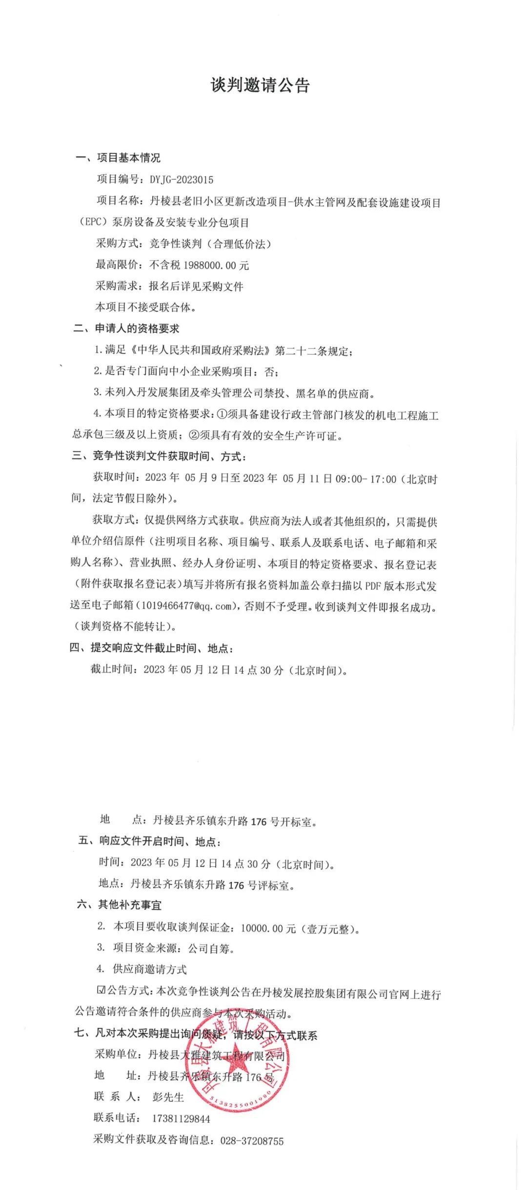 丹棱縣老舊小區(qū)更新改造項(xiàng)目-供水主管網(wǎng)及配套設(shè)施建設(shè)項(xiàng)目(EPC)泵房設(shè)備及安裝專(zhuān)業(yè)分包項(xiàng)目談判邀請(qǐng)公告