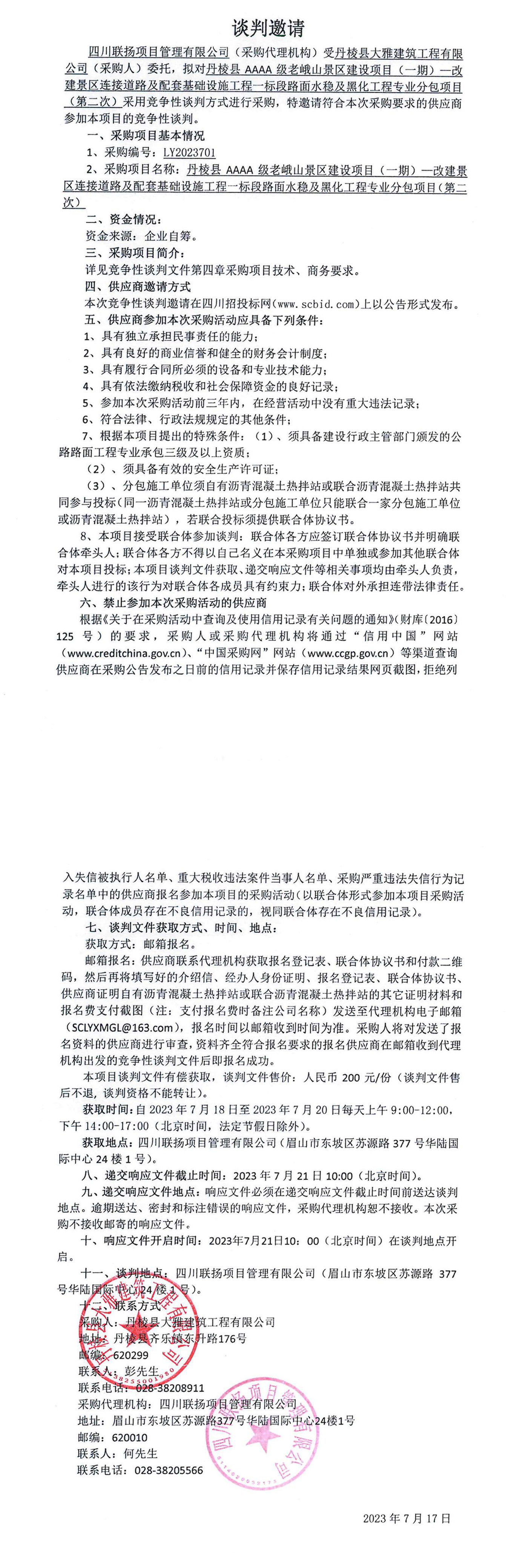 丹棱縣AAAA級老峨山景區(qū)建設(shè)項(xiàng)目(一期)—改建景區(qū)連接道路及配套基礎(chǔ)設(shè)施工程一標(biāo)段水穩(wěn)及黑化工程專業(yè)分包談判邀請公告(第二次)