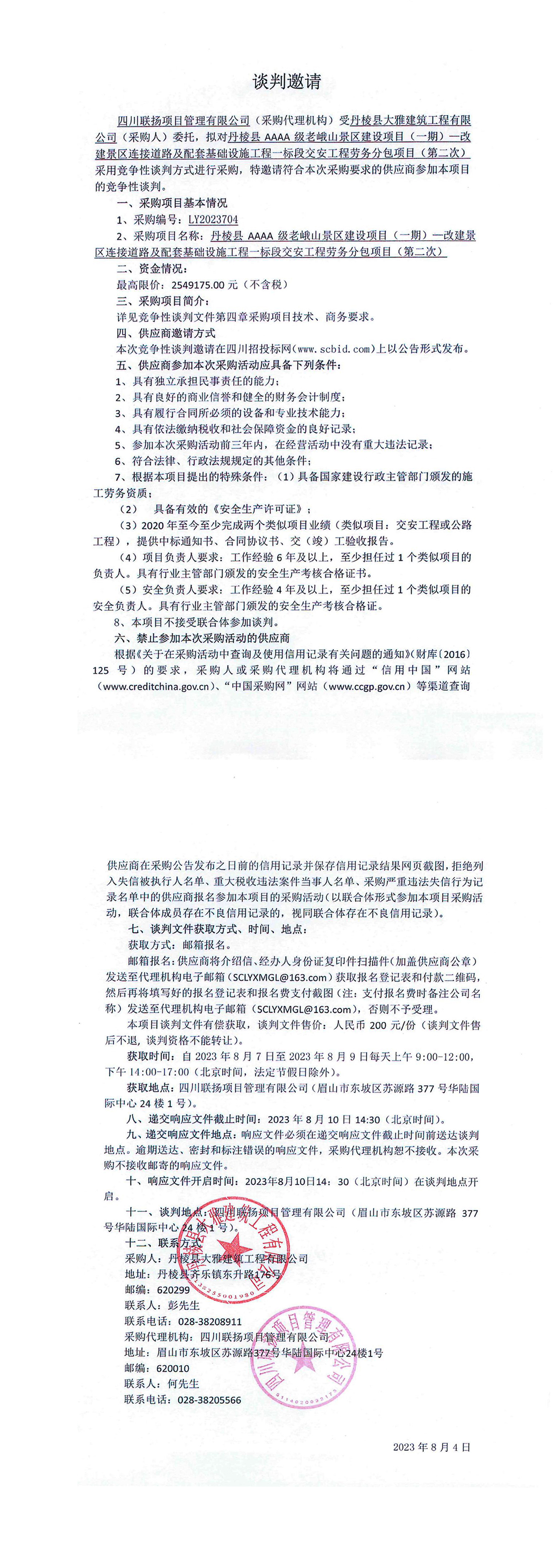 丹棱縣AAAA級老峨山景區(qū)建設(shè)項目(一期)一改建景區(qū)連接道路及配套基礎(chǔ)設(shè)施工程一標(biāo)段交安工程勞務(wù)分包項目(第二次)談判邀請
