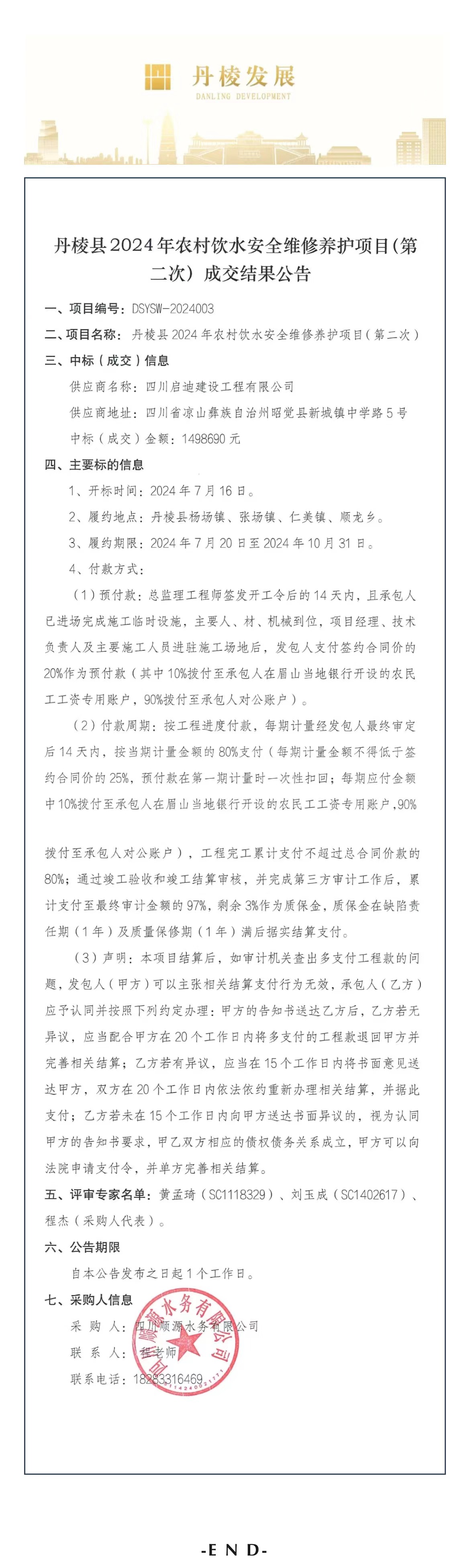 丹棱縣2024年農(nóng)村飲水安全維修養(yǎng)護(hù)項(xiàng)目(第二次)成交結(jié)果公告