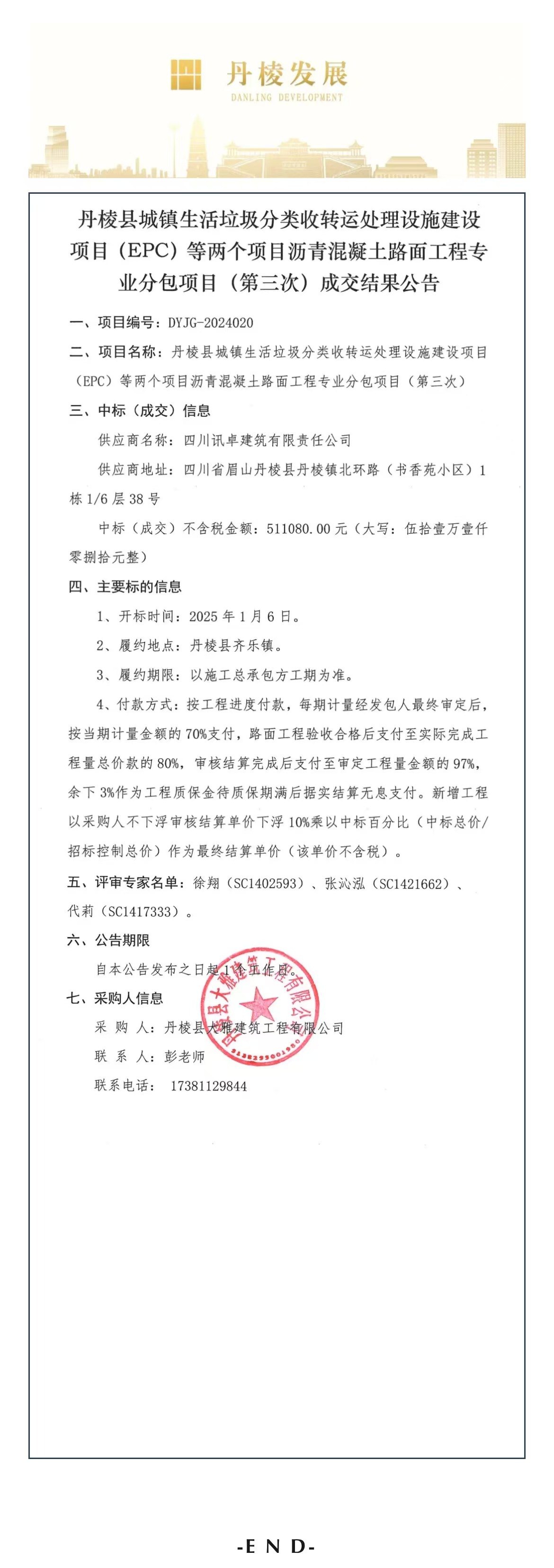 丹棱縣城鎮(zhèn)生活垃圾分類收轉(zhuǎn)運處理設(shè)施建設(shè)項目(EPC)等兩個項目瀝青混凝土路面工程專業(yè)分包項目(第三次)成交結(jié)果公告