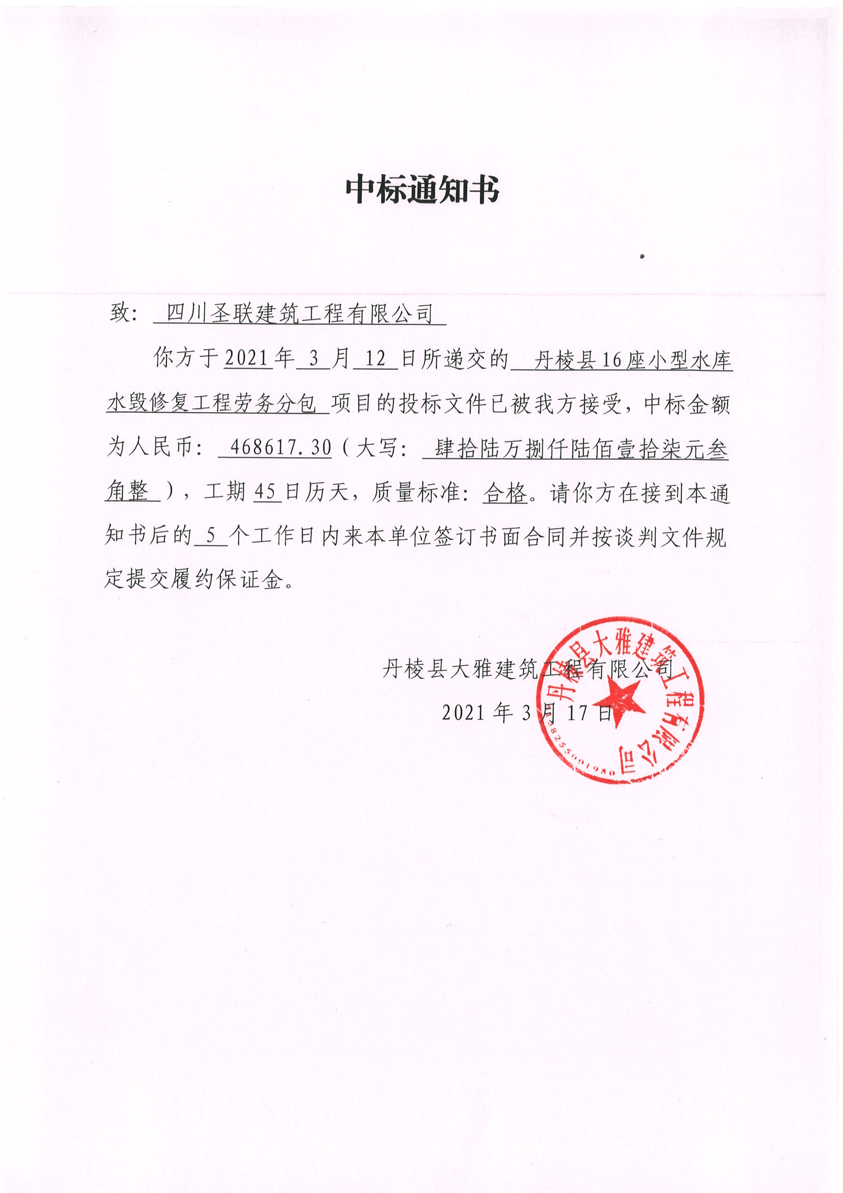 【大雅建筑公司】丹棱縣16座小型水庫水毀修復(fù)工程勞務(wù)分包中標(biāo)成交公告
