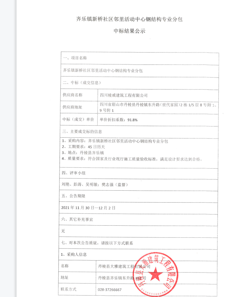 【大雅建筑公司】齊樂鎮(zhèn)新橋社區(qū)鄰里活動中心鋼結(jié)構(gòu)專業(yè)分包中標結(jié)果公示