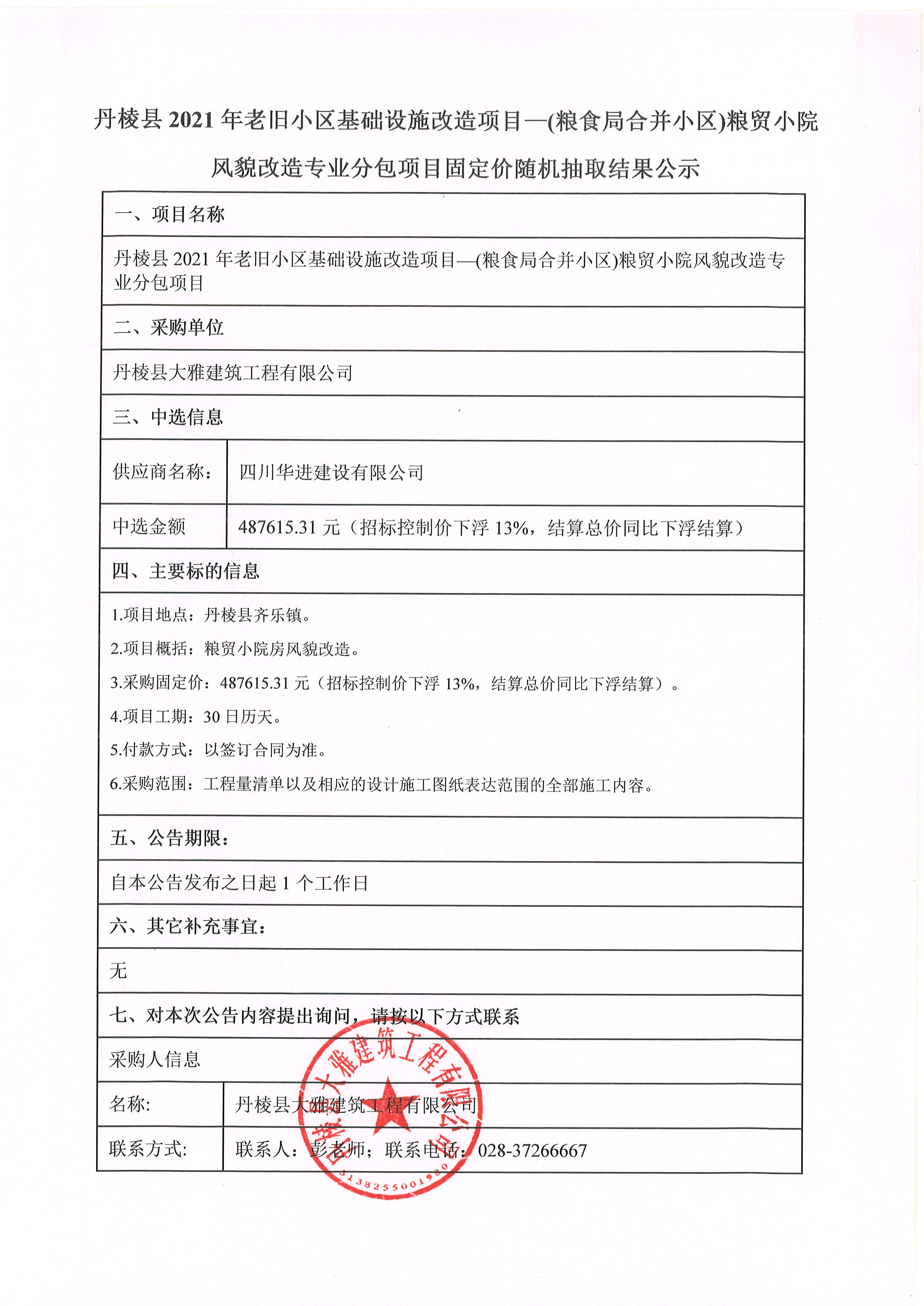丹棱縣2021年老舊小區(qū)基礎(chǔ)設(shè)施改造項(xiàng)目一(糧食局合并小區(qū))糧貿(mào)小院 風(fēng)貌改造專(zhuān)業(yè)分包項(xiàng)目固定價(jià)隨機(jī)抽取結(jié)果公示