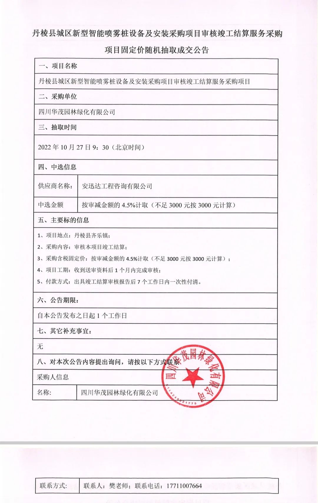 丹棱縣城區(qū)新型智能噴霧樁設(shè)備及安裝采購項(xiàng)目審核竣工結(jié)算服務(wù)采購項(xiàng)目固定價(jià)隨機(jī)抽取成交公告