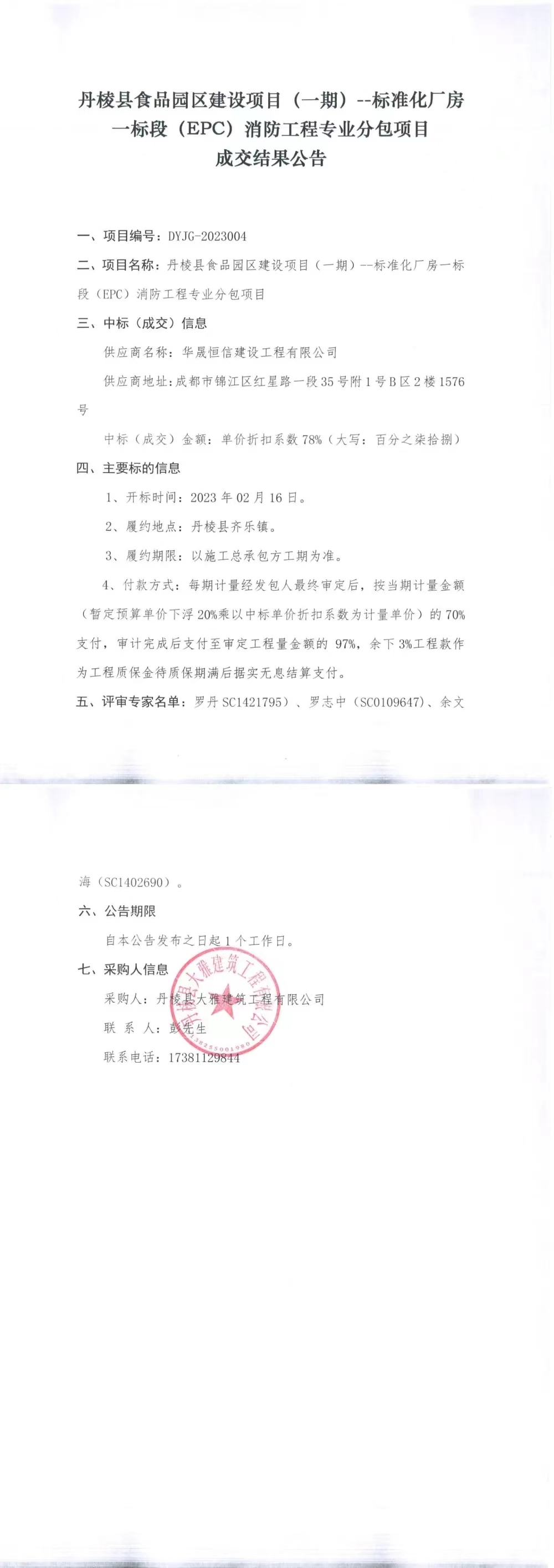 丹棱縣食品園區(qū)建設(shè)項目(一期)--標(biāo)準(zhǔn)化廠房一標(biāo)段(EPC)消防工程專業(yè)分包項目成交結(jié)果公告