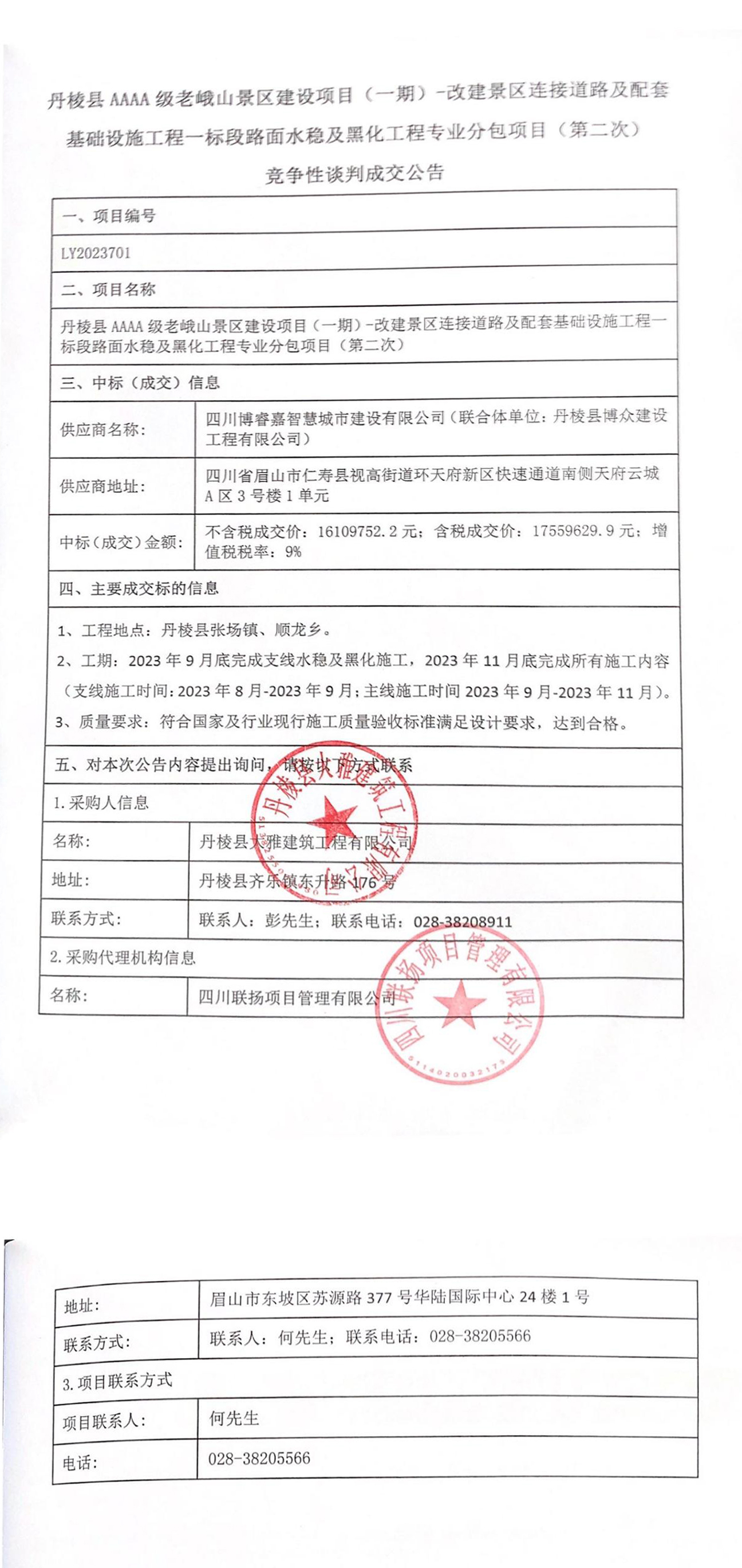 丹棱縣AAAA級老峨山景區(qū)建設(shè)項目(一期)—改建景區(qū)連接道路及配套基礎(chǔ)設(shè)施工程一標(biāo)段路面水穩(wěn)及黑化工程專業(yè)分包項目成交公告