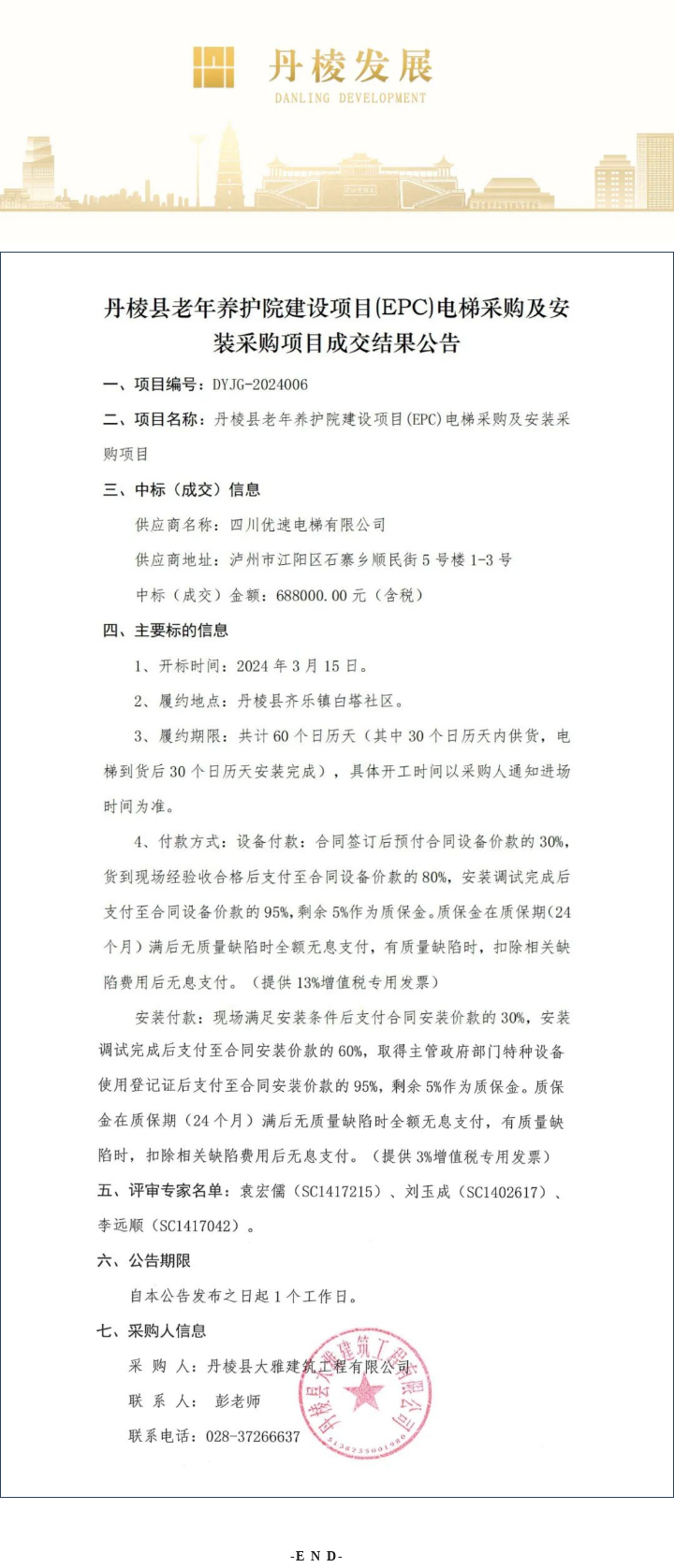 丹棱縣老年養(yǎng)護(hù)院建設(shè)項(xiàng)目(EPC)電梯采購(gòu)及安裝采購(gòu)項(xiàng)目成交結(jié)果公告