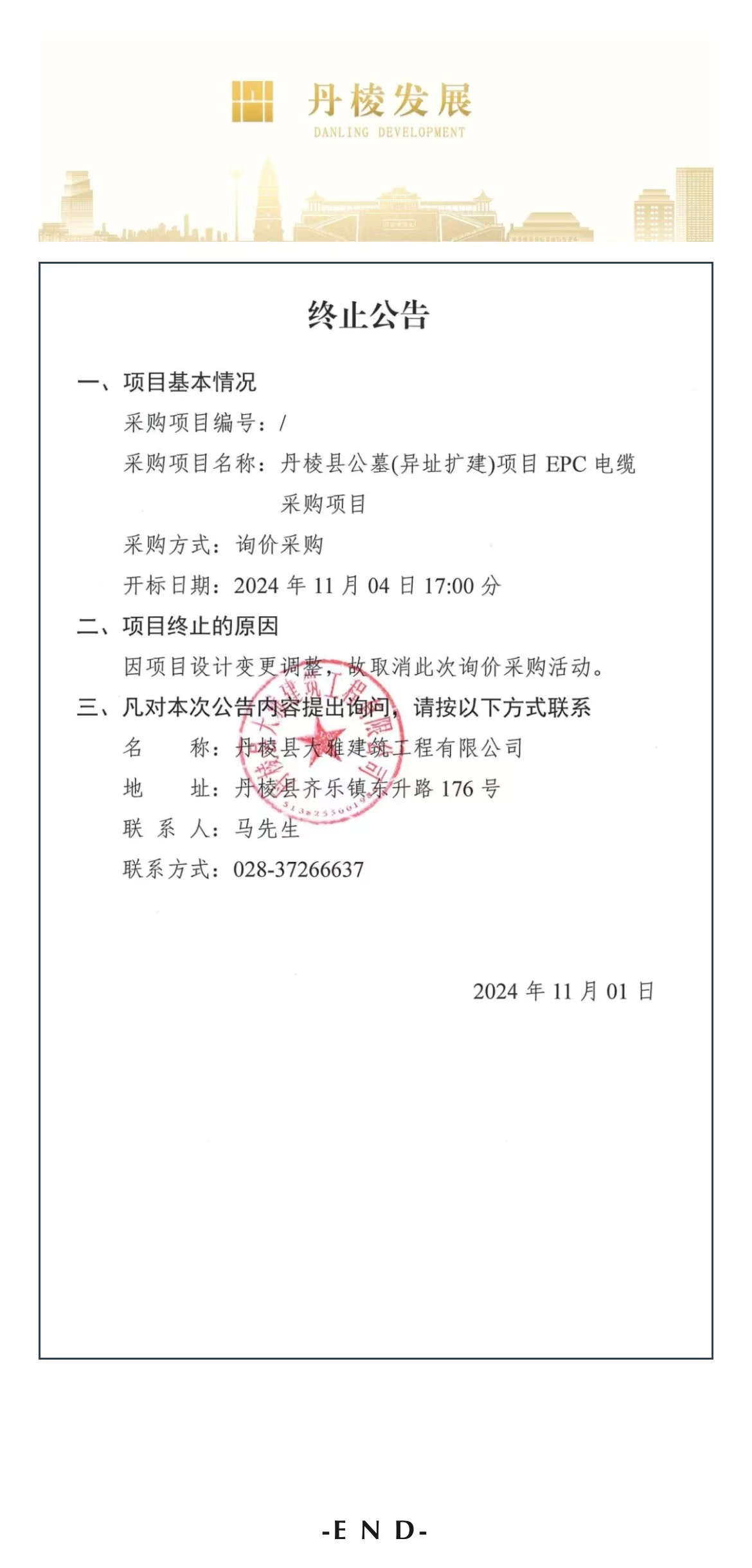 丹棱縣大雅建筑工程有限公司丹棱縣公墓(異址擴(kuò)建)項(xiàng)目EPC電纜采購終止公告