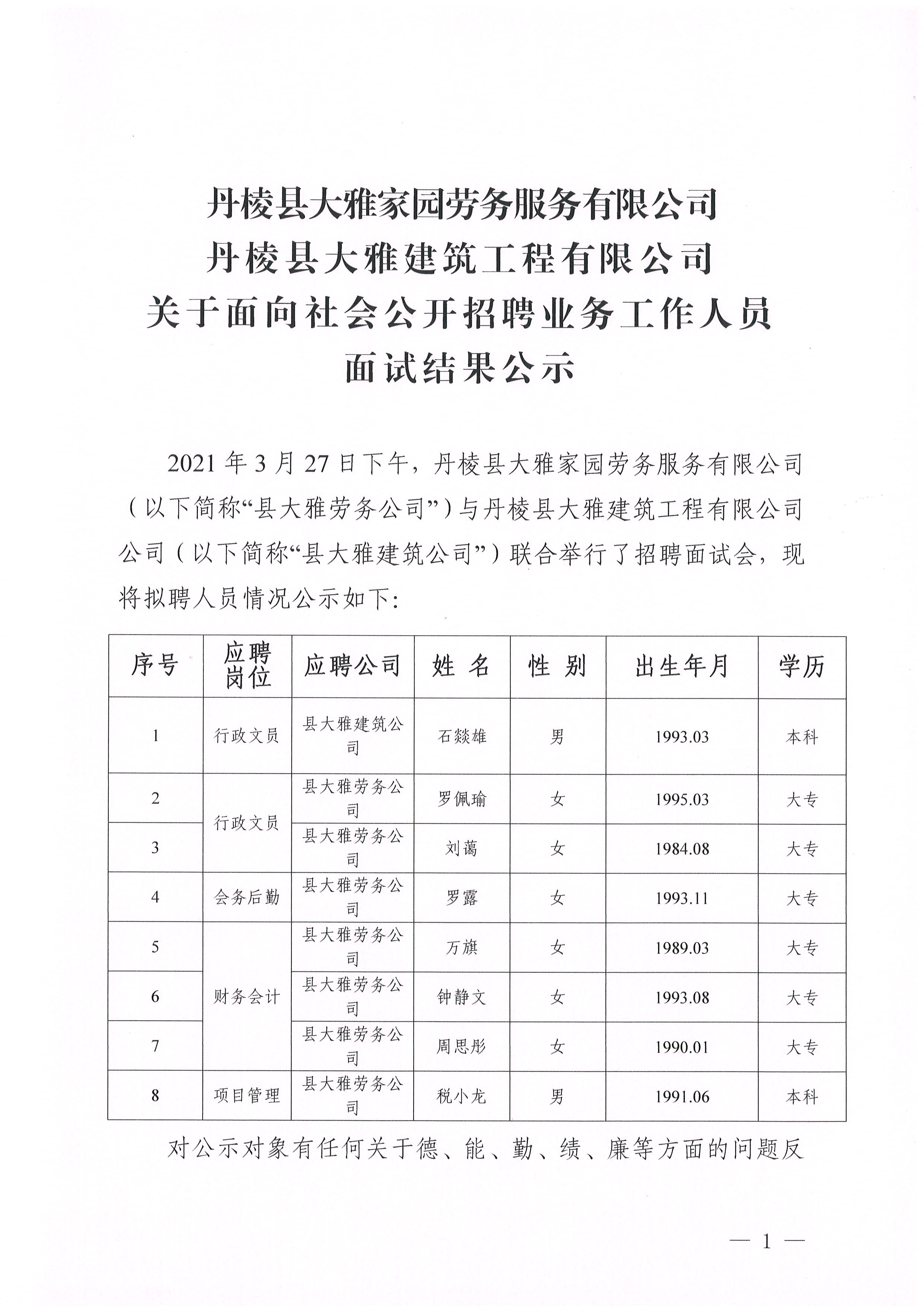 【大雅勞務(wù)公司】【大雅建筑公司】關(guān)于面向社會(huì)公開(kāi)招聘業(yè)務(wù)工作人員 面試結(jié)果公示