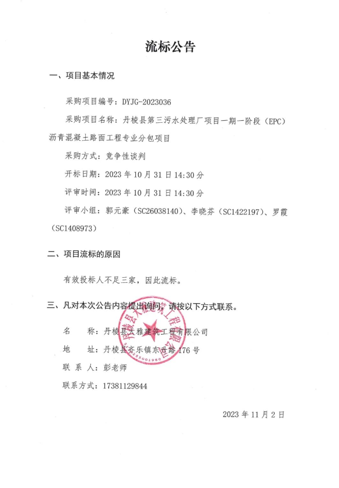 丹棱縣第三污水處理廠項目一期一階段(EPC)瀝青混凝土路面工程專業(yè)分包項目流標(biāo)公告
