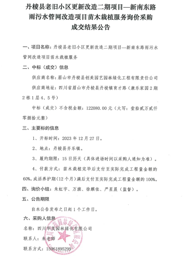 丹棱縣老舊小區(qū)更新改造二期項目——新南東路雨污水管網(wǎng)改造項目苗木栽植服務(wù)詢價采購成交結(jié)果公告