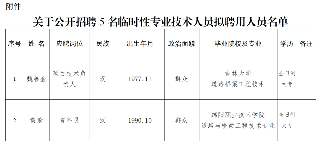 附件:關(guān)于公開招聘5名臨時性專業(yè)技術(shù)人員擬聘用人員名單