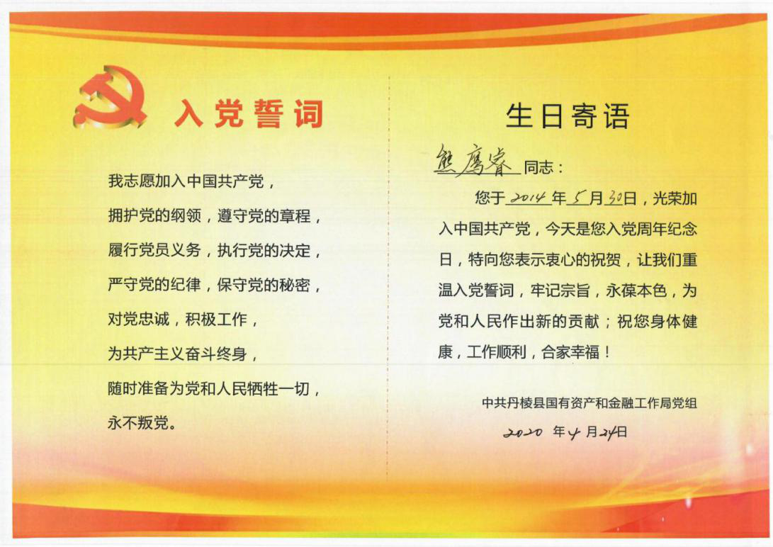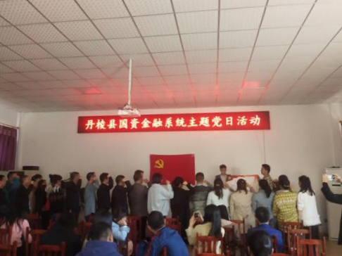工作安排后,縣國資金融局黨組集體為5月入黨黨員過政治生日,縣國資金融局(縣金融服務(wù)中心)副主任茍永慶同志為“過生日”的黨員們送上精心制作的“黨員政治生日卡”,勉勵黨員同志要“常思入黨初衷、銘記入黨誓詞、牢記黨員義務(wù)”,發(fā)揮黨員先鋒模范作用,在今后的工作中不斷創(chuàng)先爭優(yōu),做好表率;顒幼詈螅w黨員同志在縣國資金融局黨組成員、副局長潘國榮同志的帶領(lǐng)下重溫入黨誓詞、面對黨旗莊嚴宣誓。